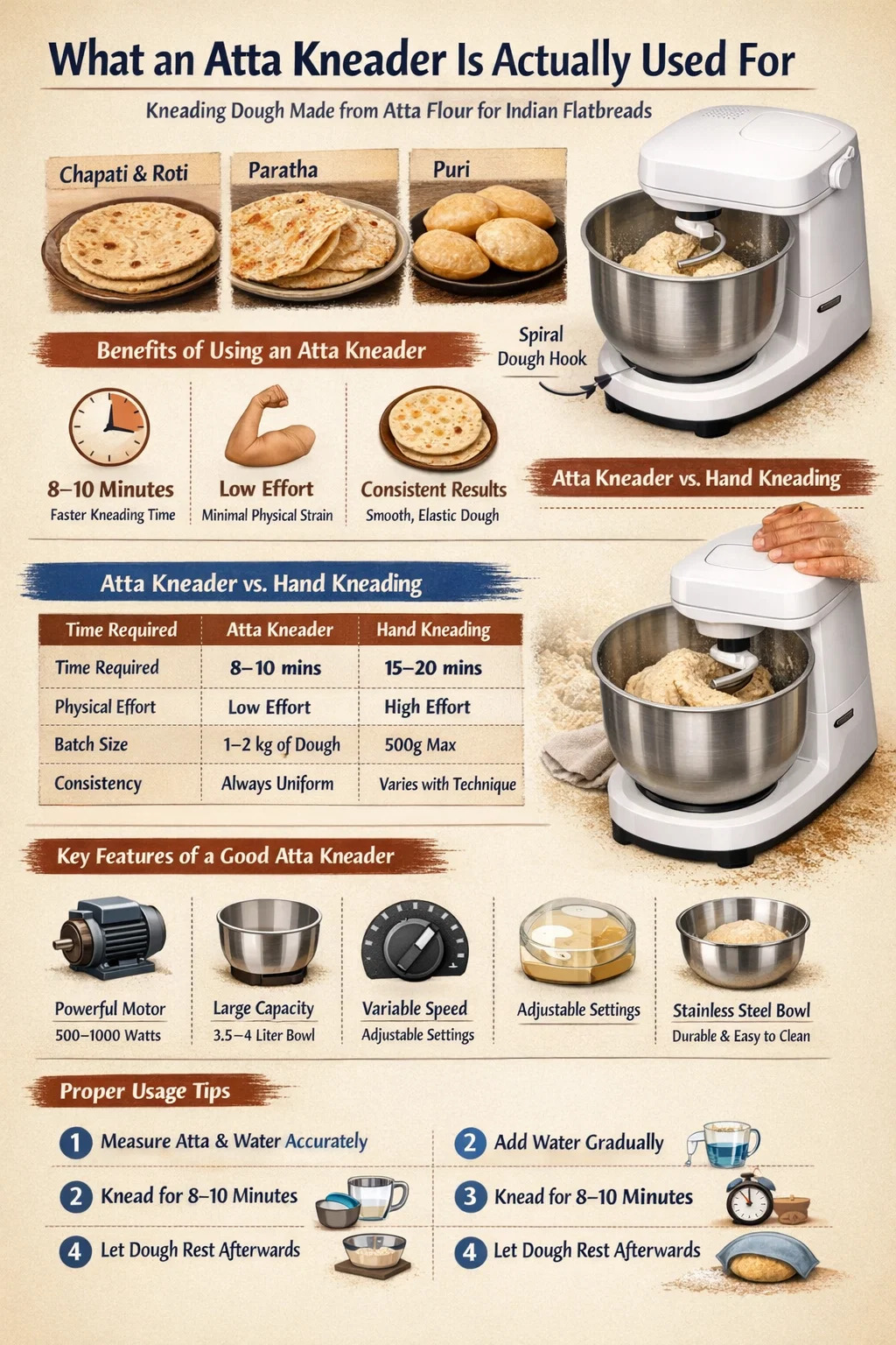 Kritik nokta, rafine una göre daha yüksek lif içeriğine sahip bir tam buğday unu olan atta'nın daha yoğun ve hidrasyona daha dayanıklı olmasıdır. Atta için tasarlanmış bir yoğurucu, motoru aşırı ısıtmadan veya mekanizmayı zorlamadan bu yoğunluğu idare edecek şekilde kalibre edilmiştir.